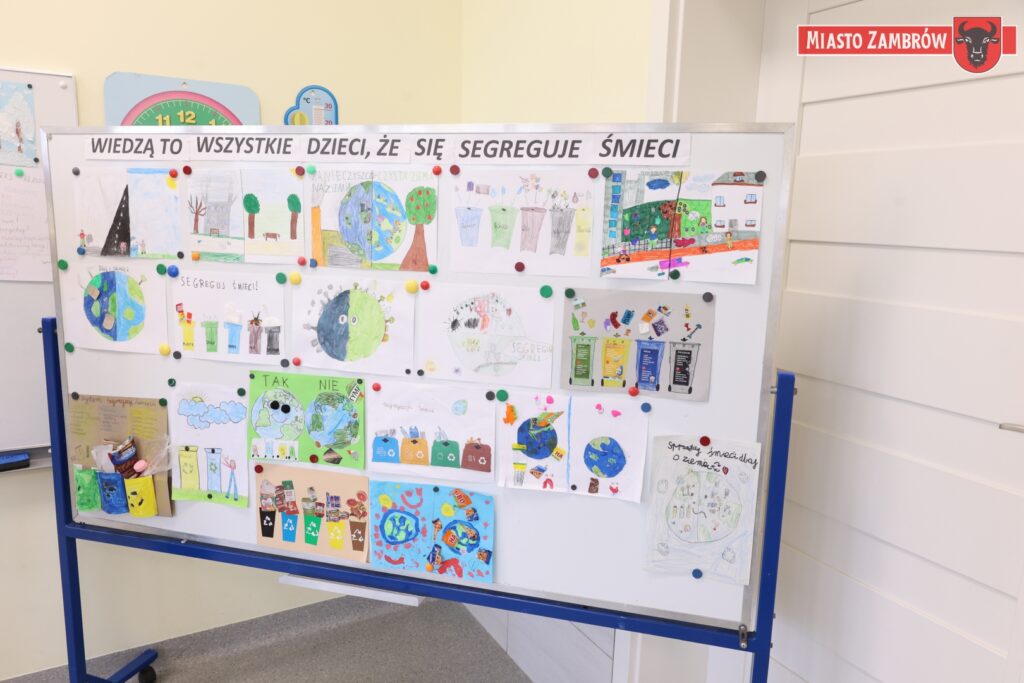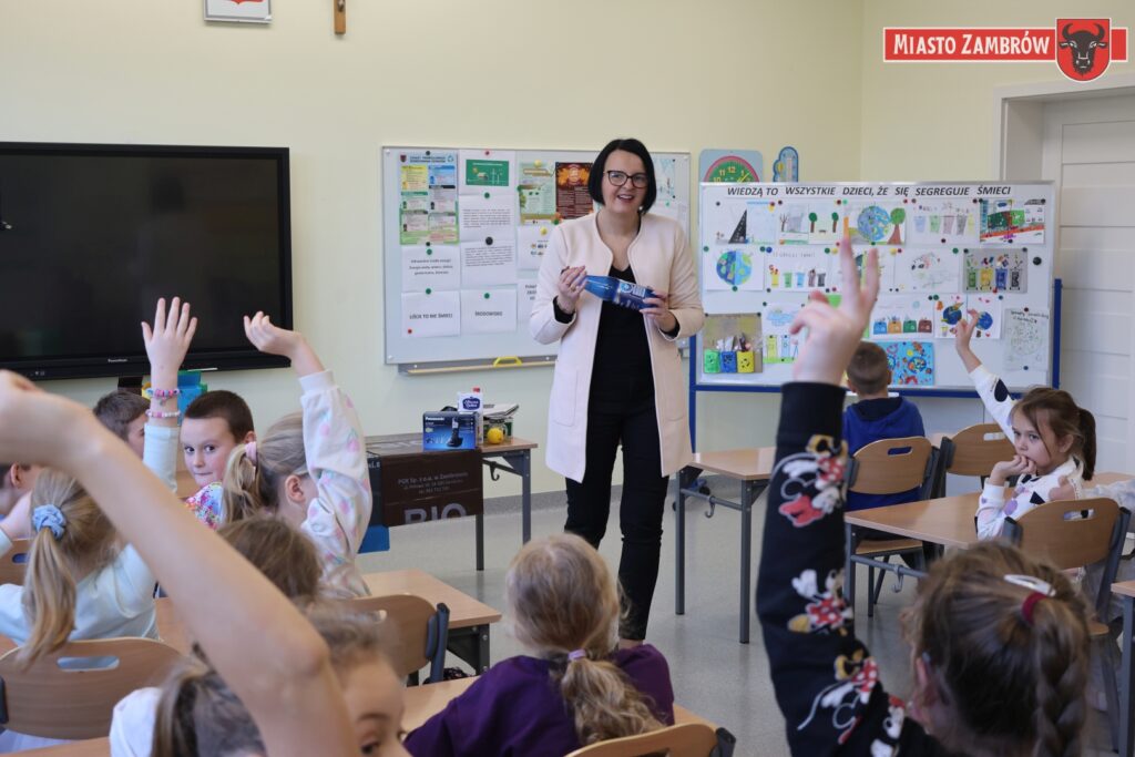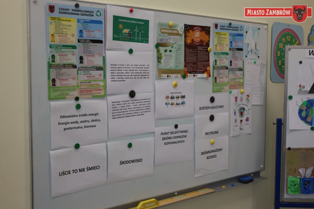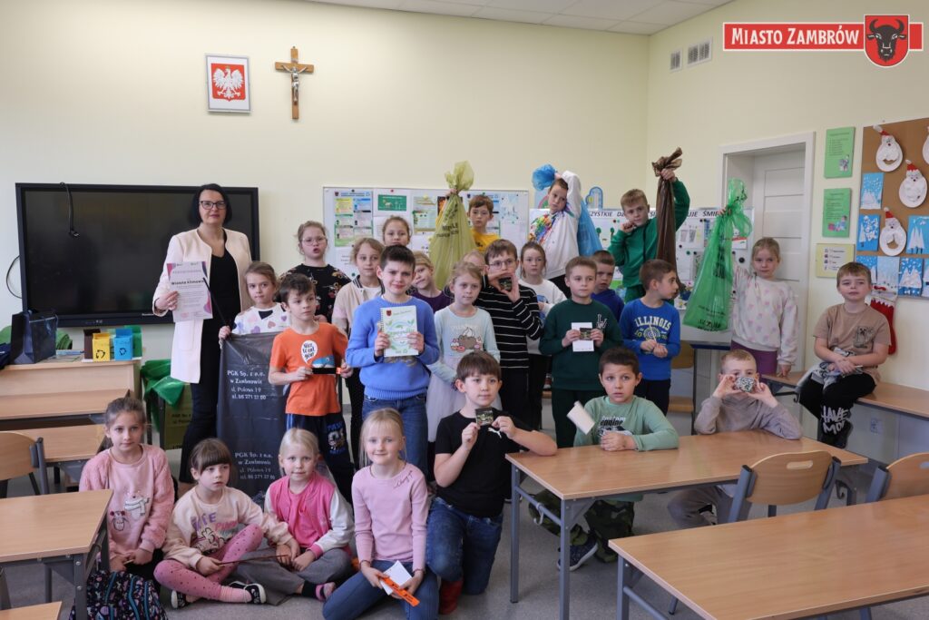w ramach realizacji projektu grantowego Czysta Moc Energii. Uczniowie klas I-III uczestniczyli w spotkaniu z panią Wioletą Klimowicz, pracownikiem Wydziału Gospodarki Komunalnej Urzędu Miasta w Zambrowie. Przygotowując się do spotkania pod okiem opiekuna Koła Młodego Ekologa, uczniowie wykonali prace plastyczne związane z ochroną środowiska