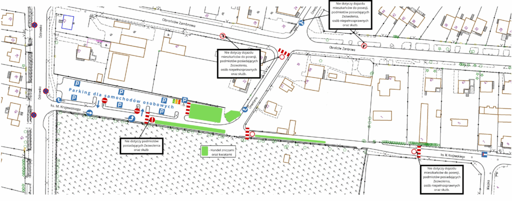 – wjazd na ulicę Cmentarną ze skrzyżowania z ulicą Obrońców Zambrowa będzie możliwy jedynie dla dojazdu mieszkańców do posesji, podmiotów posiadających stosowne zezwolenia, osób z niepełnosprawnościami oraz służb,