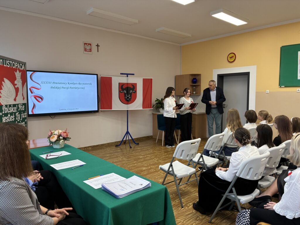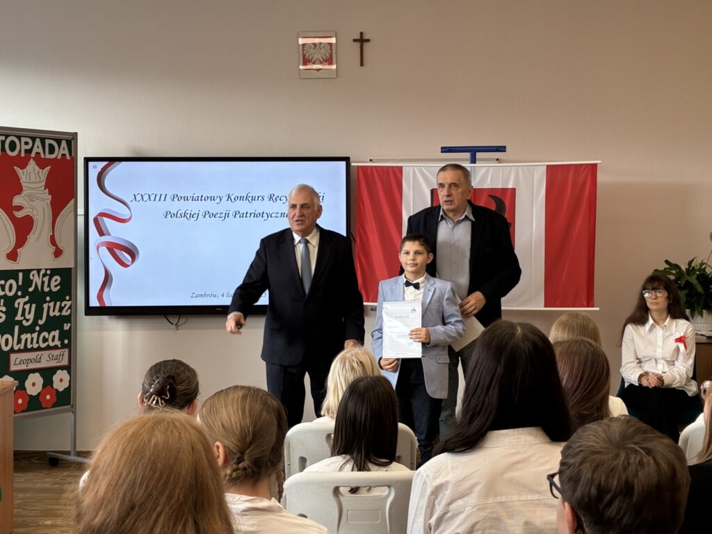 4 listopada mury Szkoły Podstawowej nr 5 w Zambrowie wypełniły się dźwiękiem pięknych, patriotycznych wierszy. Tego dnia odbył się XXXIII Powiatowy Konkurs Recytatorski Polskiej Poezji Patriotycznej, który przyciągnął niemal trzydziestu uzdolnionych młodych recytatorów z całego powiatu. Komisja konkursowa w składzie – p. Grażyna Dąbkowska, p. Ewelina Kierznowska, p. Anna Budrowska – wyłoniła zwycięzców w dwóch grupach wiekowych.