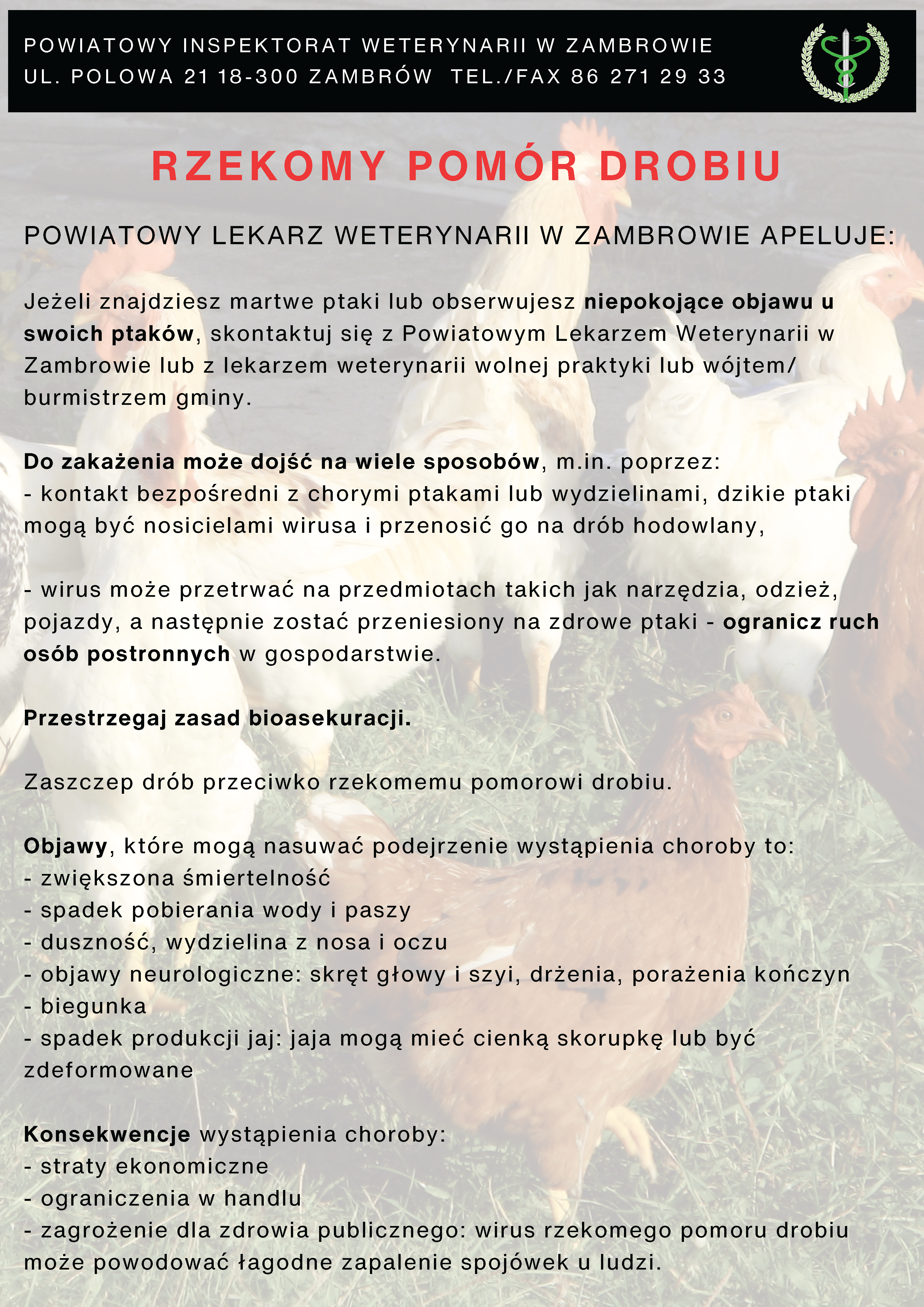 Powiatowy Lekarz Weterynarii w Zambrowie apeluje o natychmiastowe wdrożenie zasad bezpieczeństwa w hodowlach drobiu w związku z ryzykiem wystąpienia wysoce zjadliwej grypy ptaków i rzekomego pomoru drobiu.