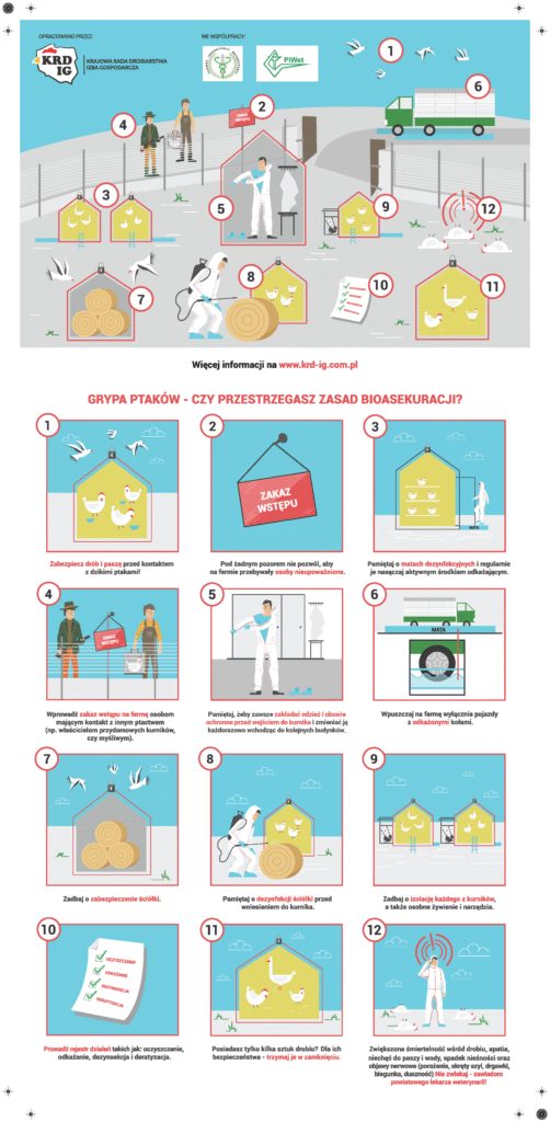 • szczelne przykrycie pojemników z karmą i wodą do picia lub przetrzymywanie ich wewnątrz budynków, a także unikanie pojenia ptaków i czyszczenia pomieszczeń wodą pochodzącą spoza gospodarstwa (głównie ze zbiorników wodnych i rzek);